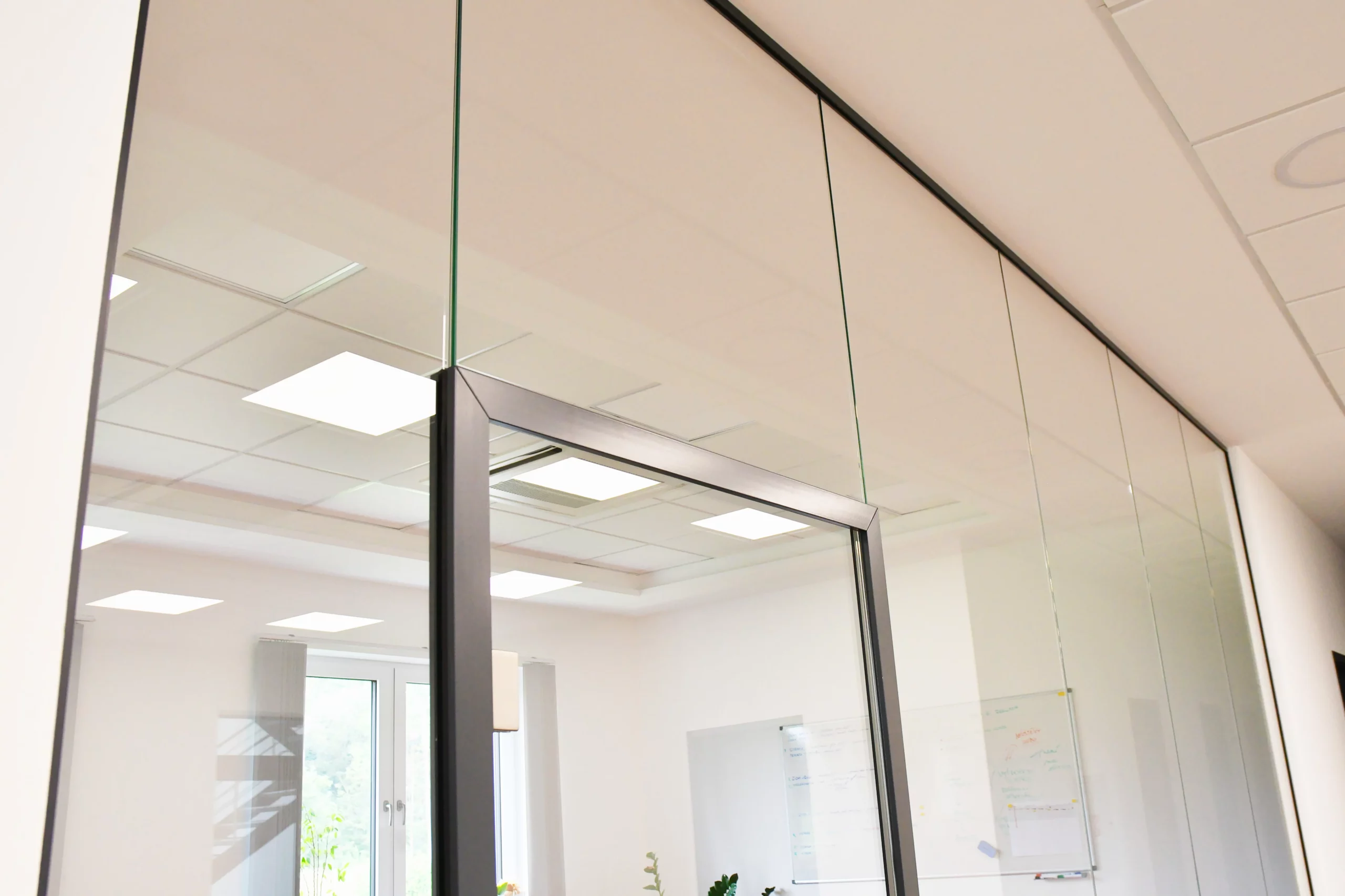 Prosklená stěna jednací místnosti s důrazem na vynikající akustickou izolaci. Při této realizaci byl kladen důraz na jednoduchý elegantní design s moderním vzhledem.